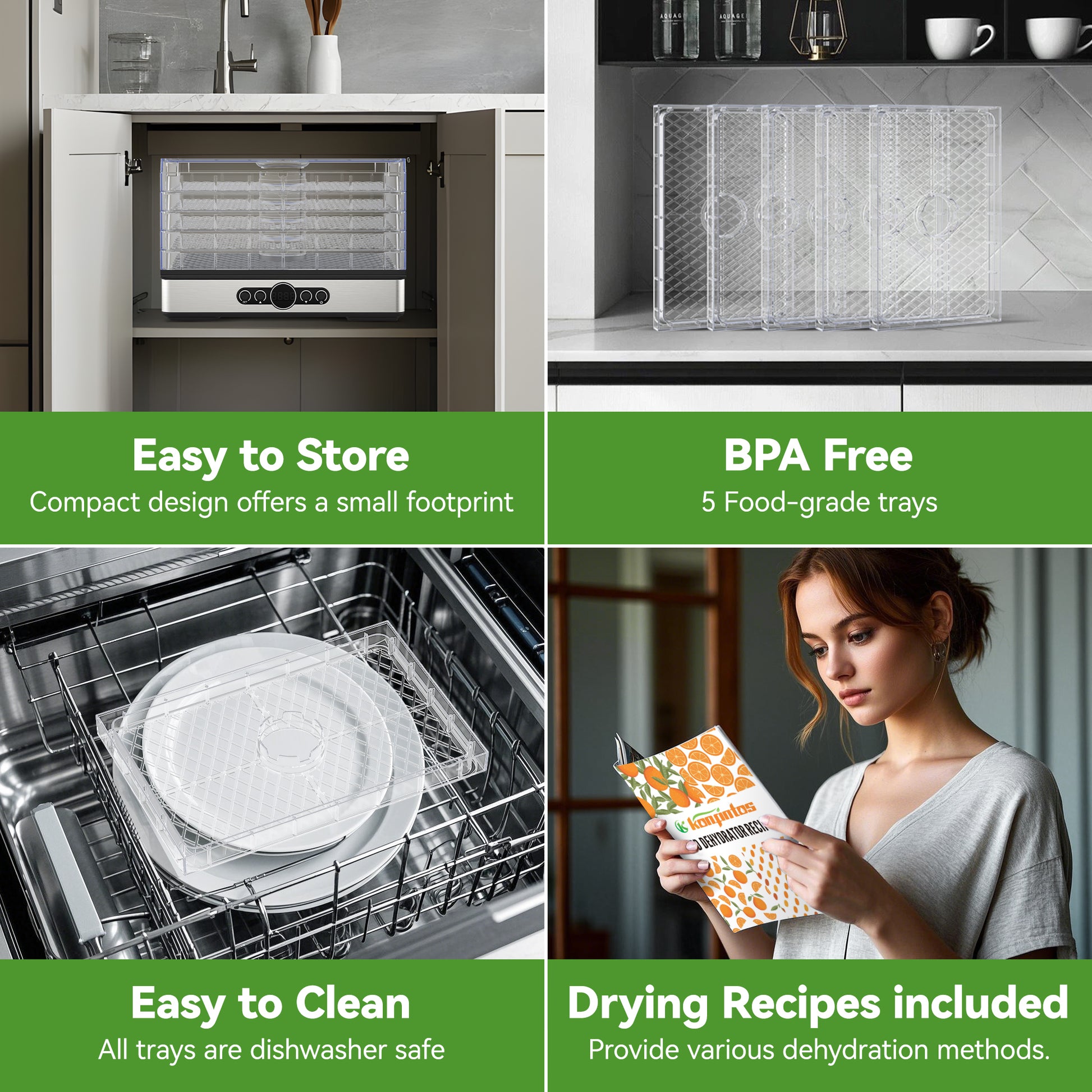 - ·COMPACT DESIGN BUT POWERFUL DRYING PROCESS: The compact design offers a small footprint and is easy to store in your kitchen while still equipped with a powerful 400W drying capacity, effectively removing excess moisture and providing ideal drying results without compromising the food’s flavors and nutritional value.