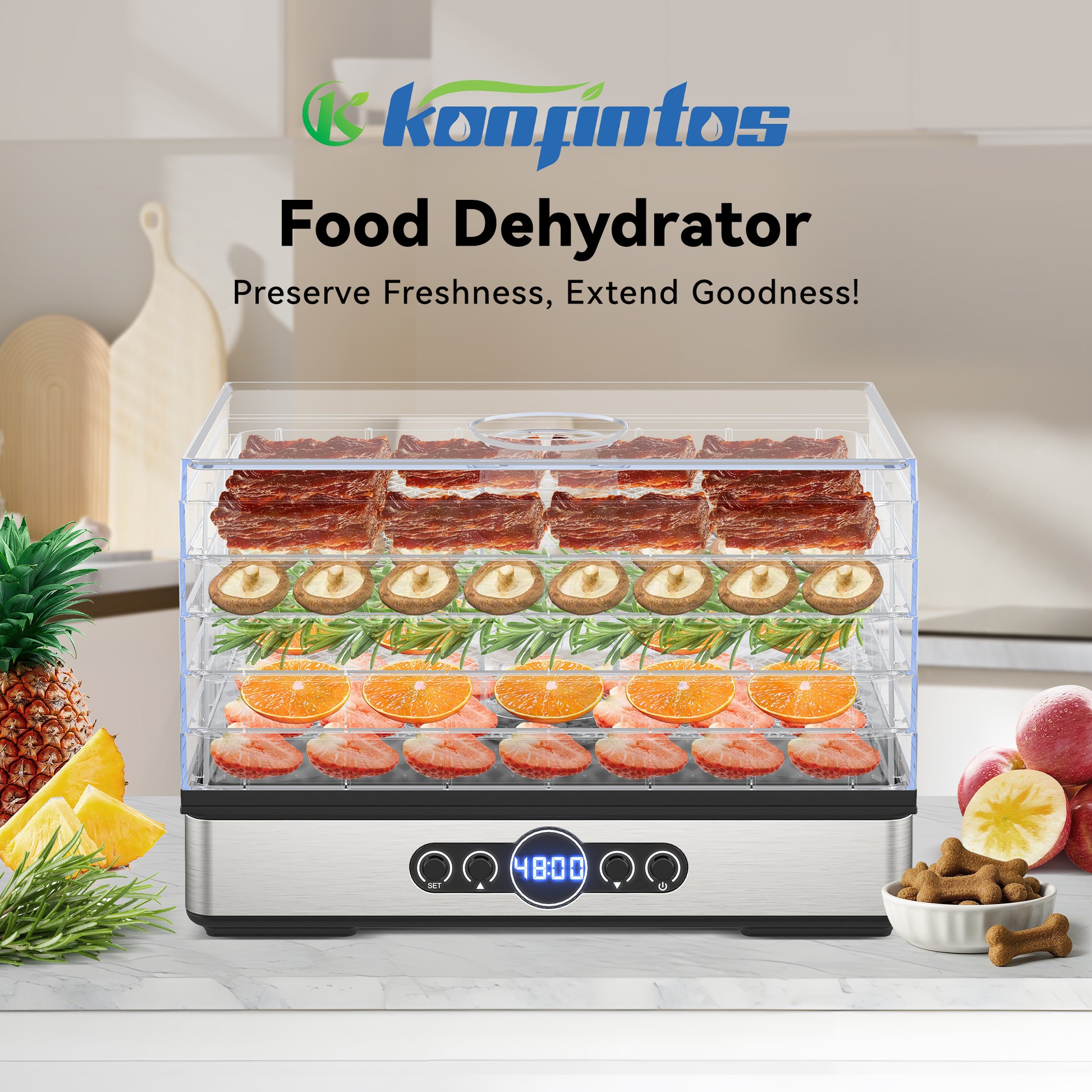 - ·5 Food-GRADE TRAYS: The dehydrator for food and jerky features 5 BPA-free trays, which can be stacked to optimize space, offering plenty of drying space and capacity. The transparent, see-through trays allow you to monitor the drying process of your food at any time.